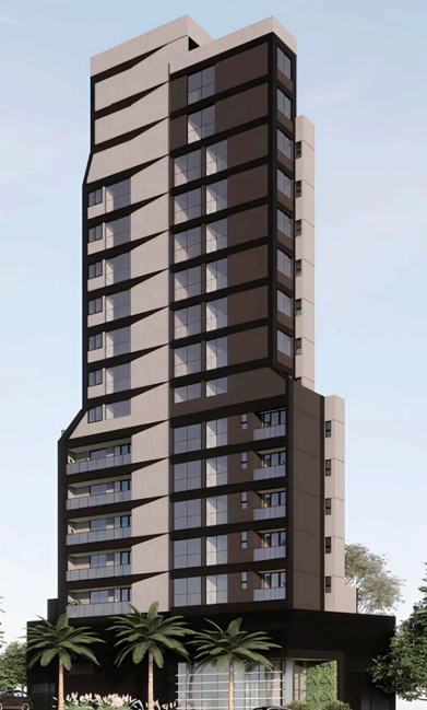 O prédio possui fachada revestida em pele de vidro e porcelanato aerado.