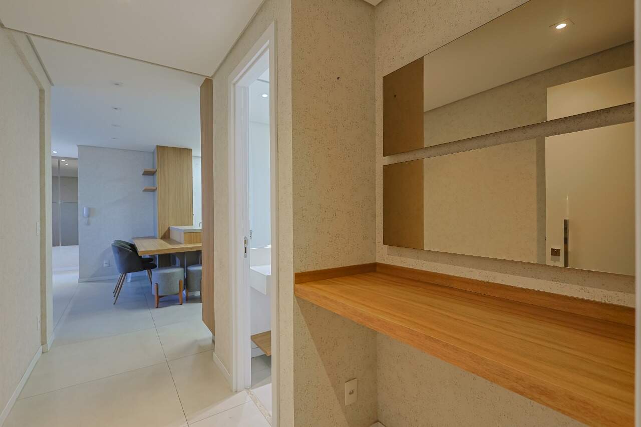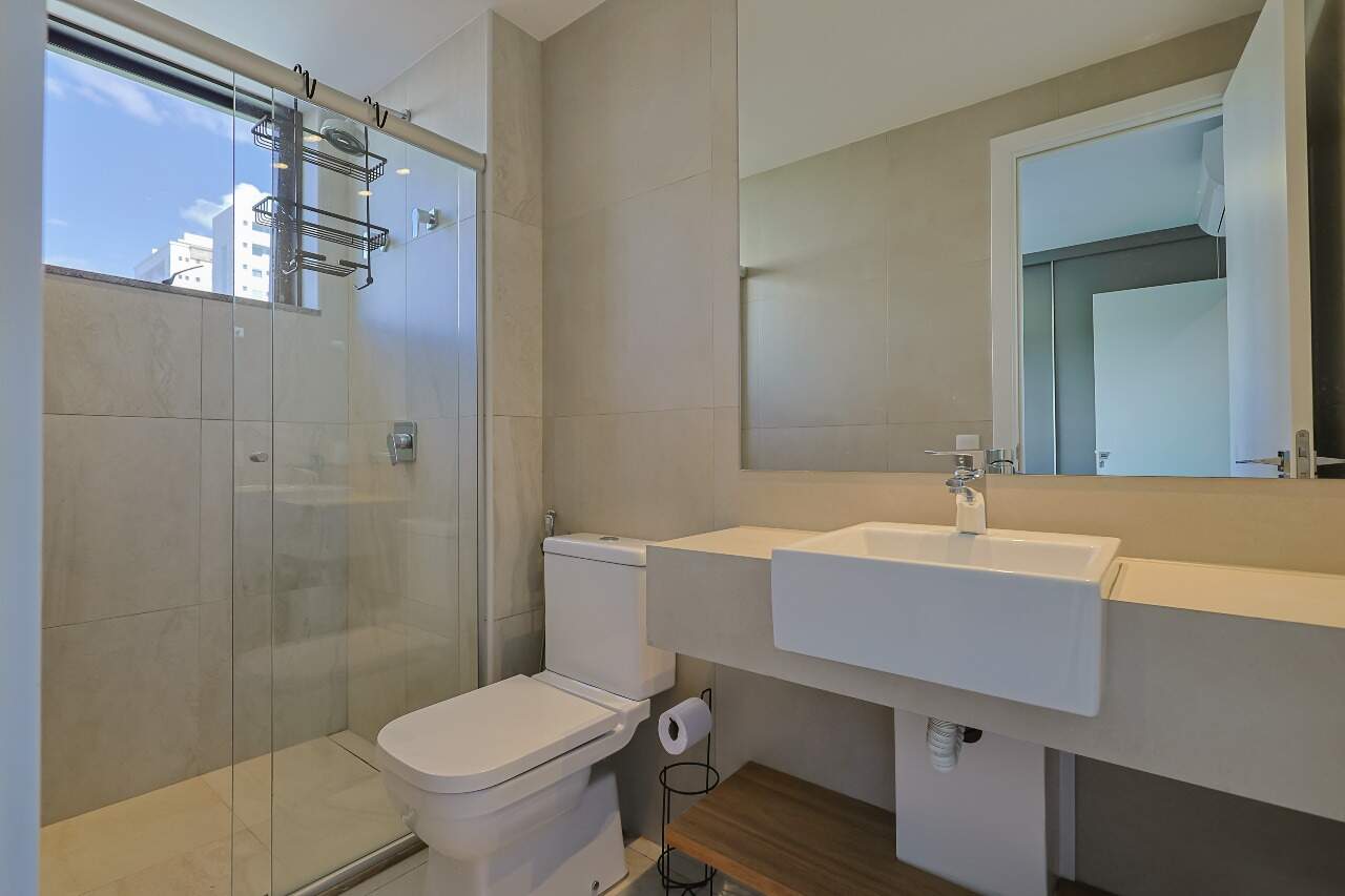 Lavabo, armários e iluminação planejados, cozinha completa e integrada à sala.