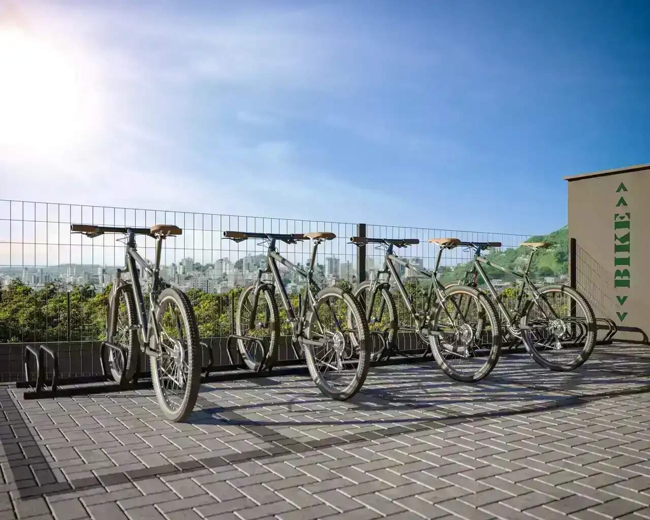 Bicicletário com bicicletas compartilhadas, ferramentas compartilhadas e o sistema VAPT (carro compartilhado para aluguel no condomínio).