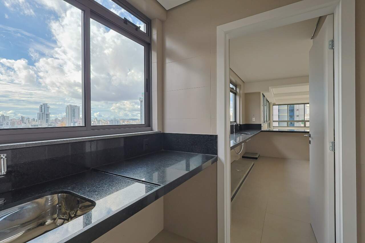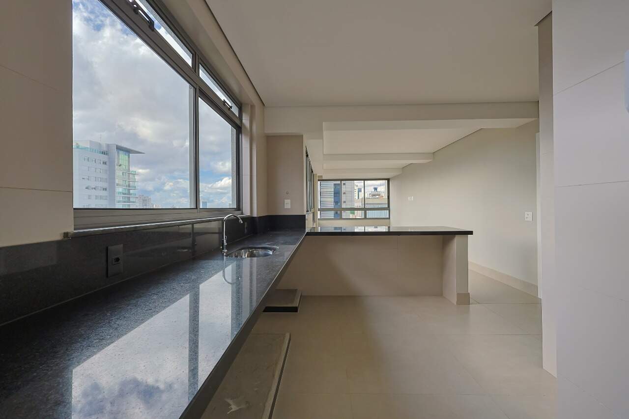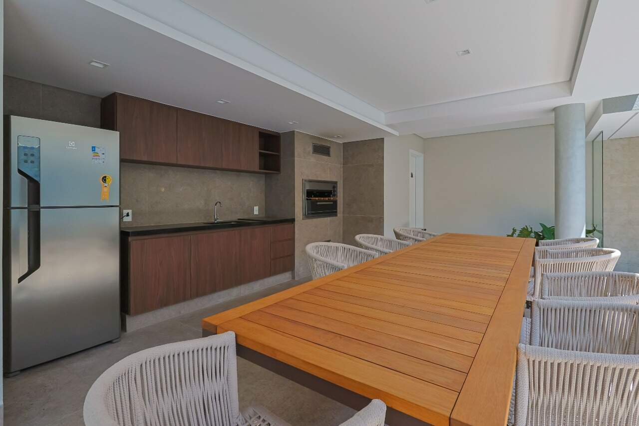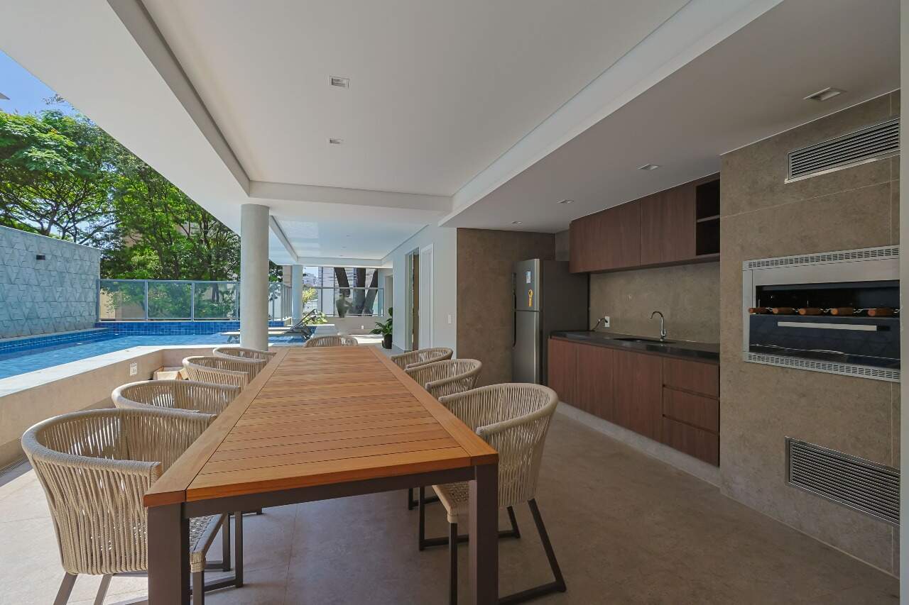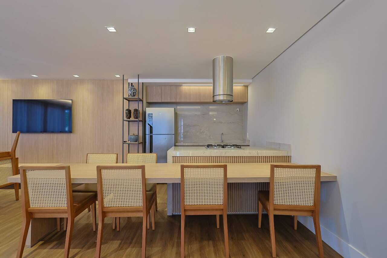 O ambiente conta com uma ampla sala de estar e jantar conectada diretamente à cozinha, criando um espaço social fluido e convidativo. A cozinha americana é equipada com uma extensa bancada em granito preto, pia em aço inox e nichos planejados. O imóvel dispõe de 3 quartos, sendo 1 suíte, além de área de serviço e lavabo.