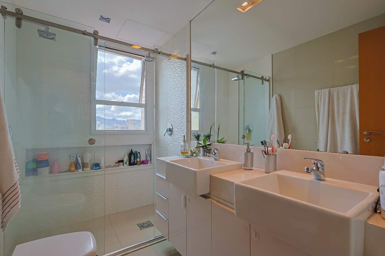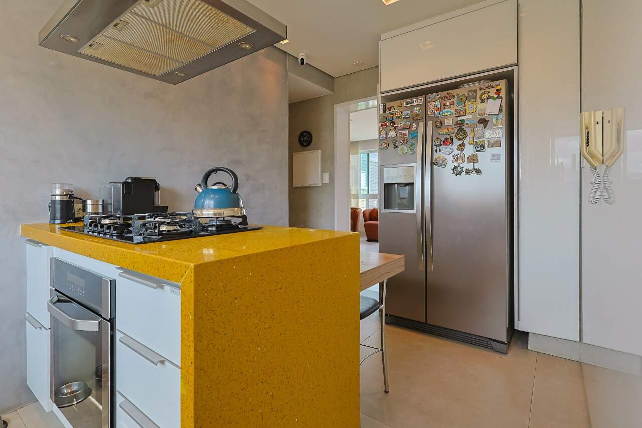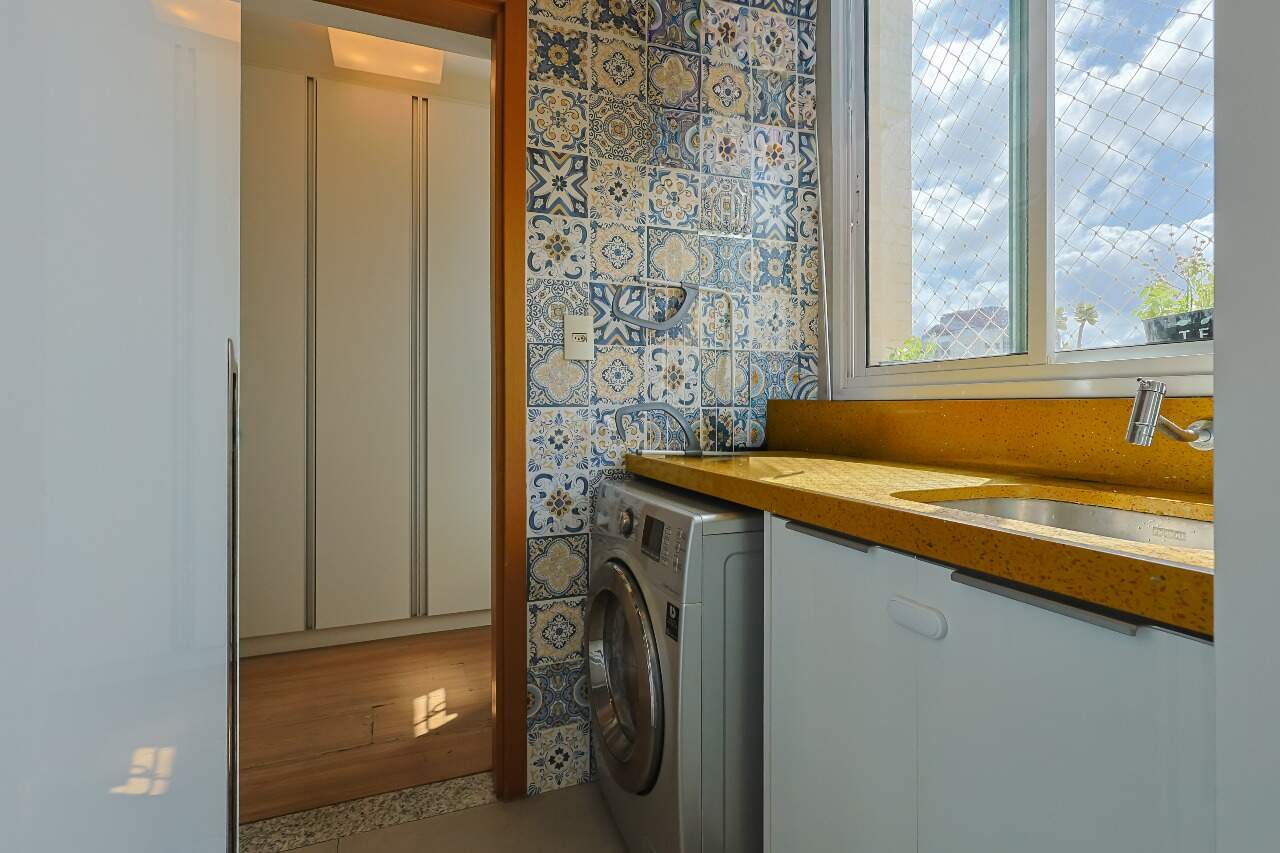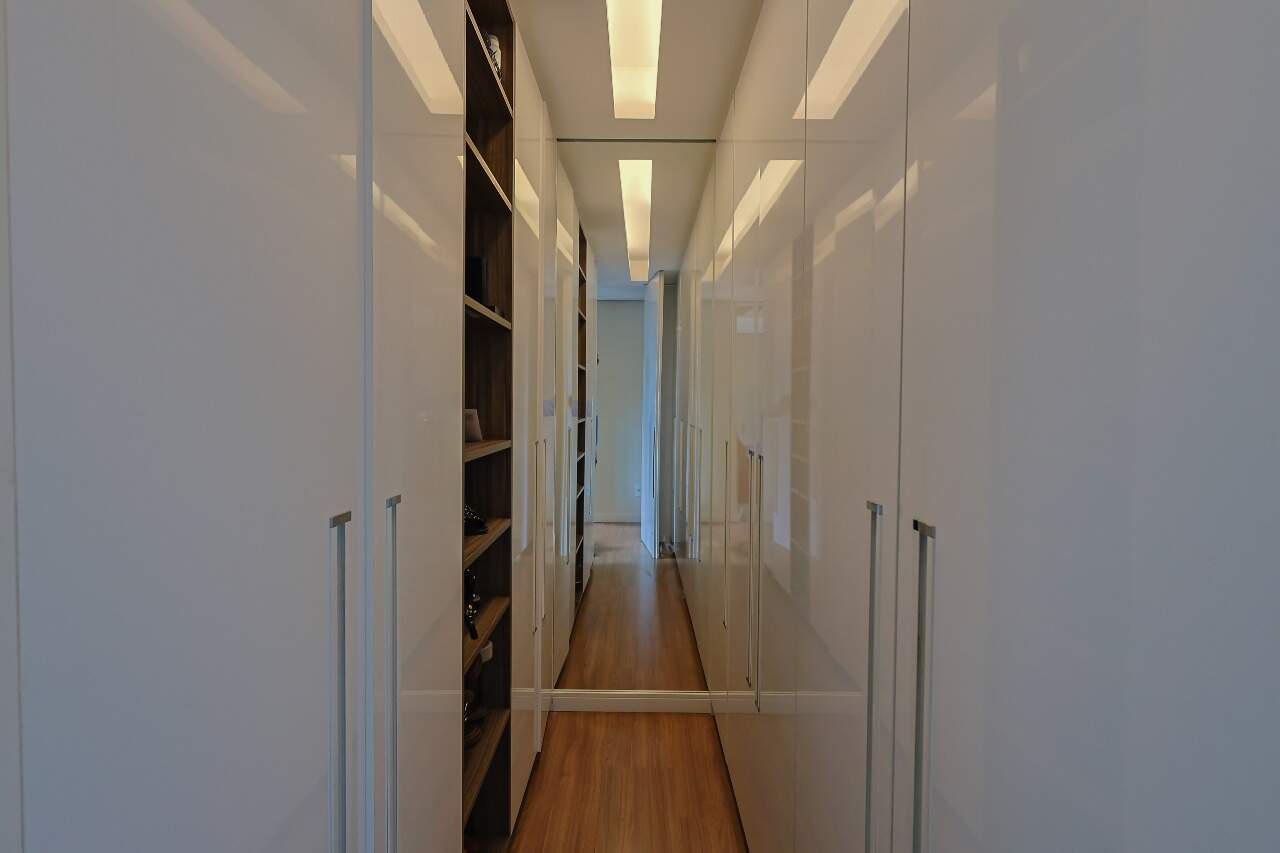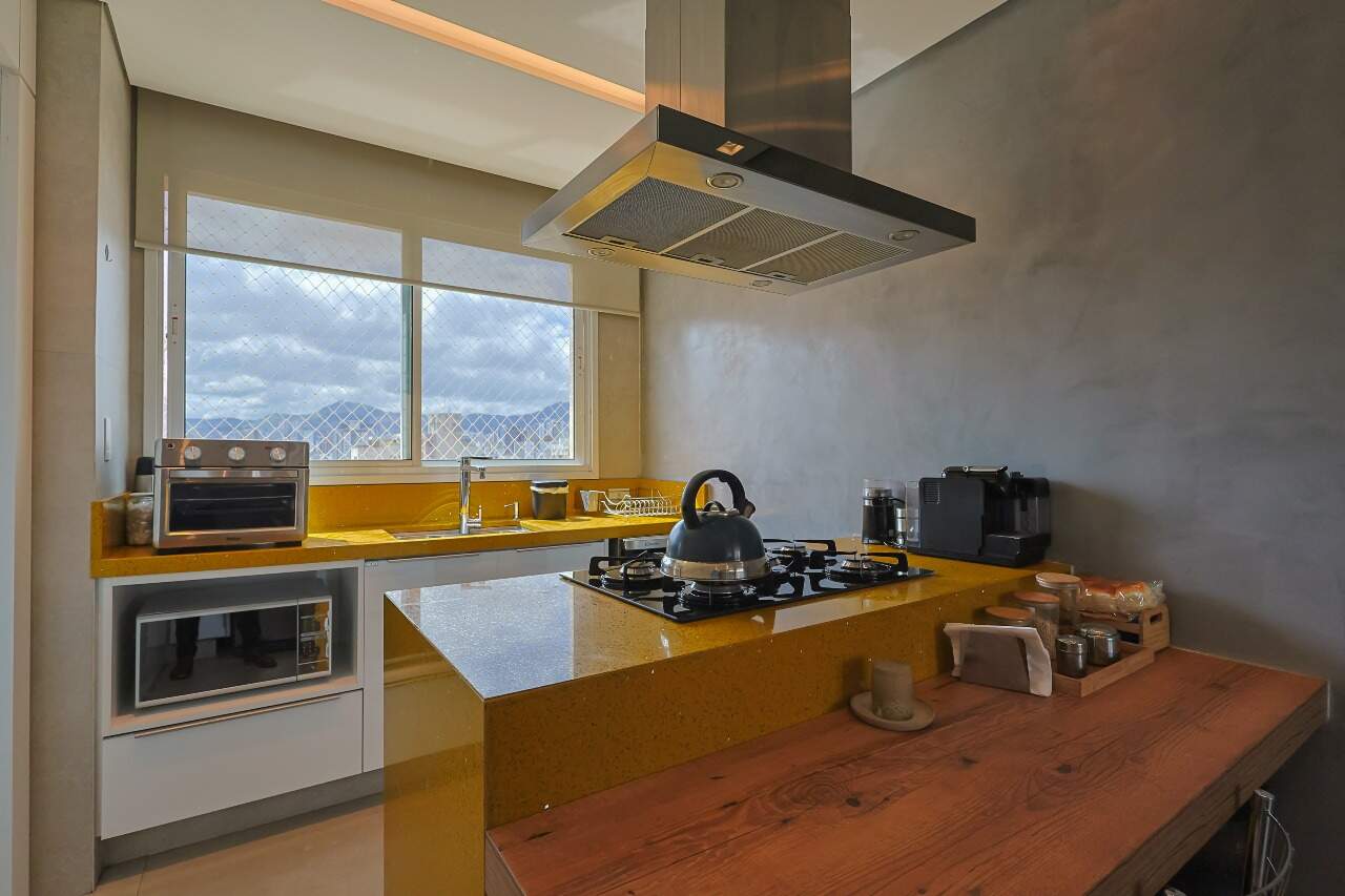 Em andar alto, este apartamento une sofisticação a uma reforma inteligente, que transformou os originais 4 quartos em 3 amplas suítes para privilegiar uma sala estendida com acabamentos de alto padrão. O requinte se manifesta nos detalhes, como o piso da sala em mármore, o painel da TV em travertino e as bancadas da cozinha em Ecoart.