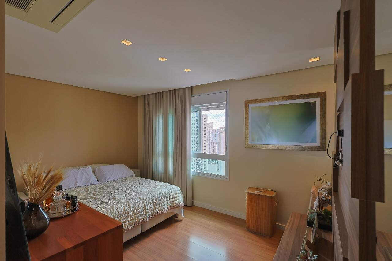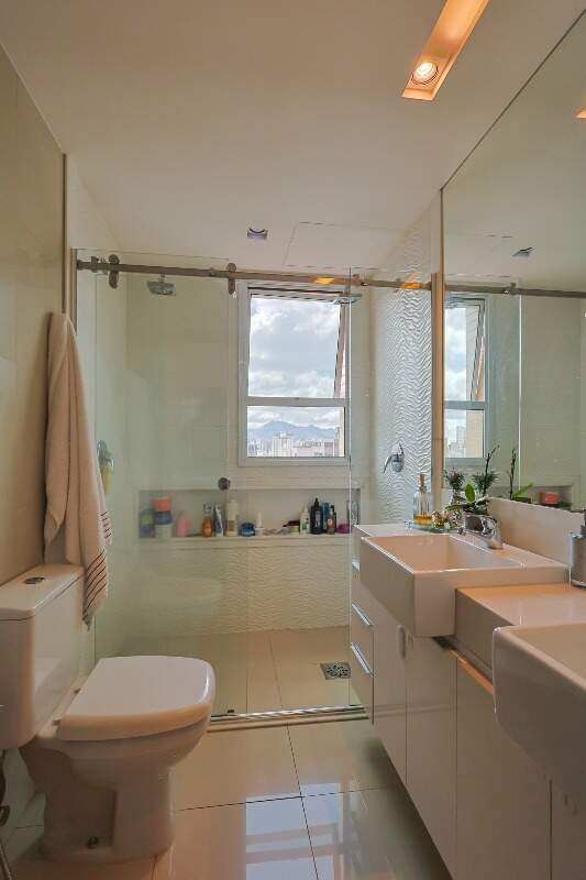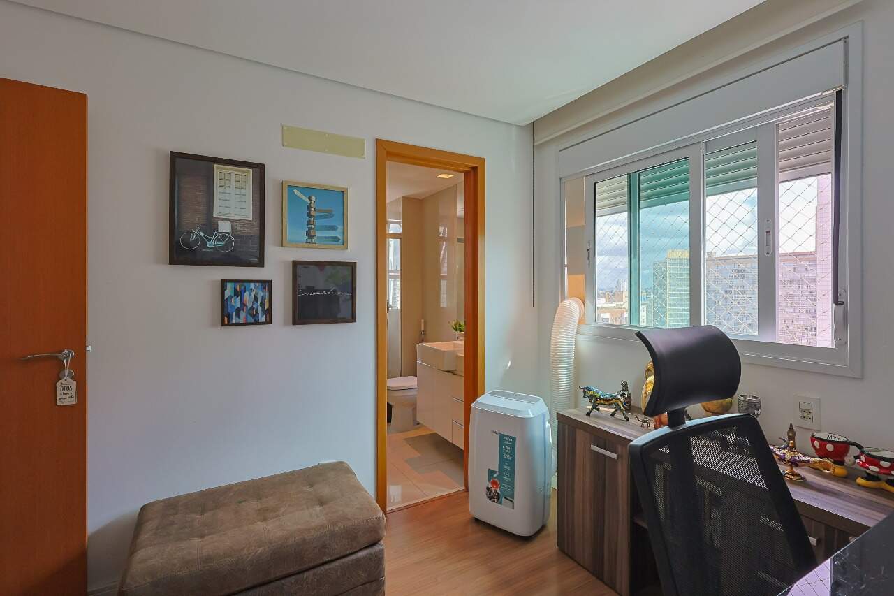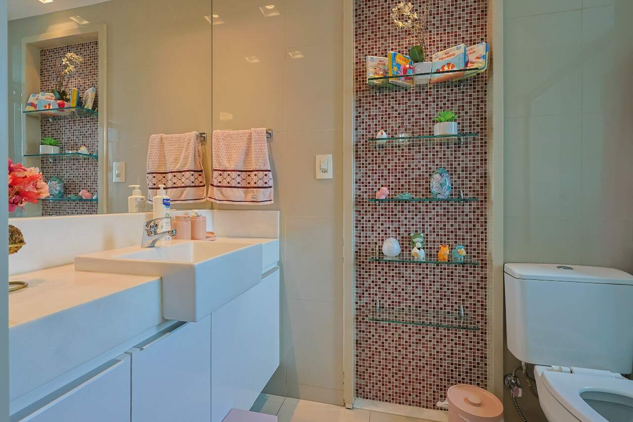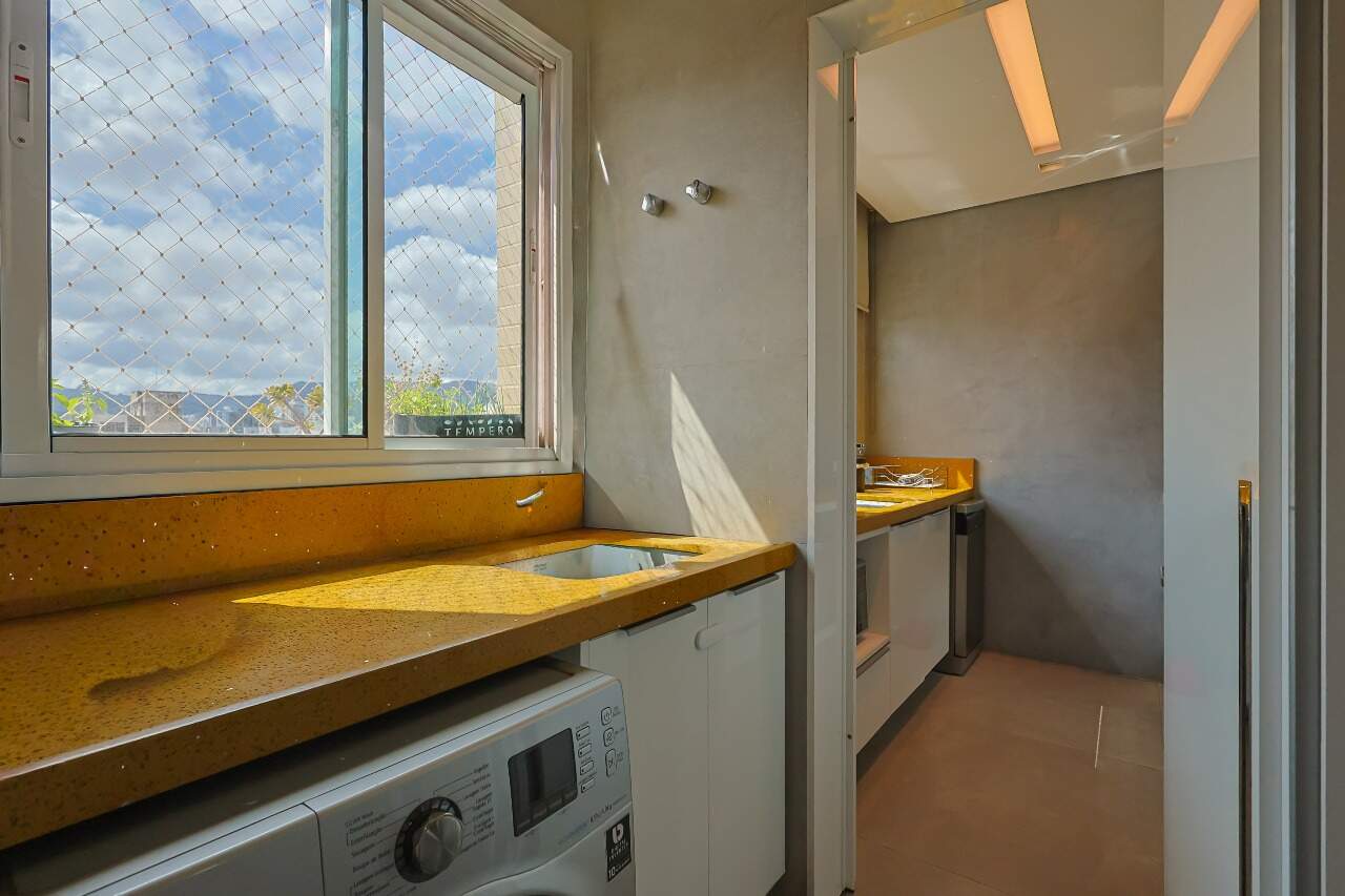 Em andar alto, este apartamento une sofisticação a uma reforma inteligente, que transformou os originais 4 quartos em 3 amplas suítes para privilegiar uma sala estendida com acabamentos de alto padrão. O requinte se manifesta nos detalhes, como o piso da sala em mármore, o painel da TV em travertino e as bancadas da cozinha em Ecoart.