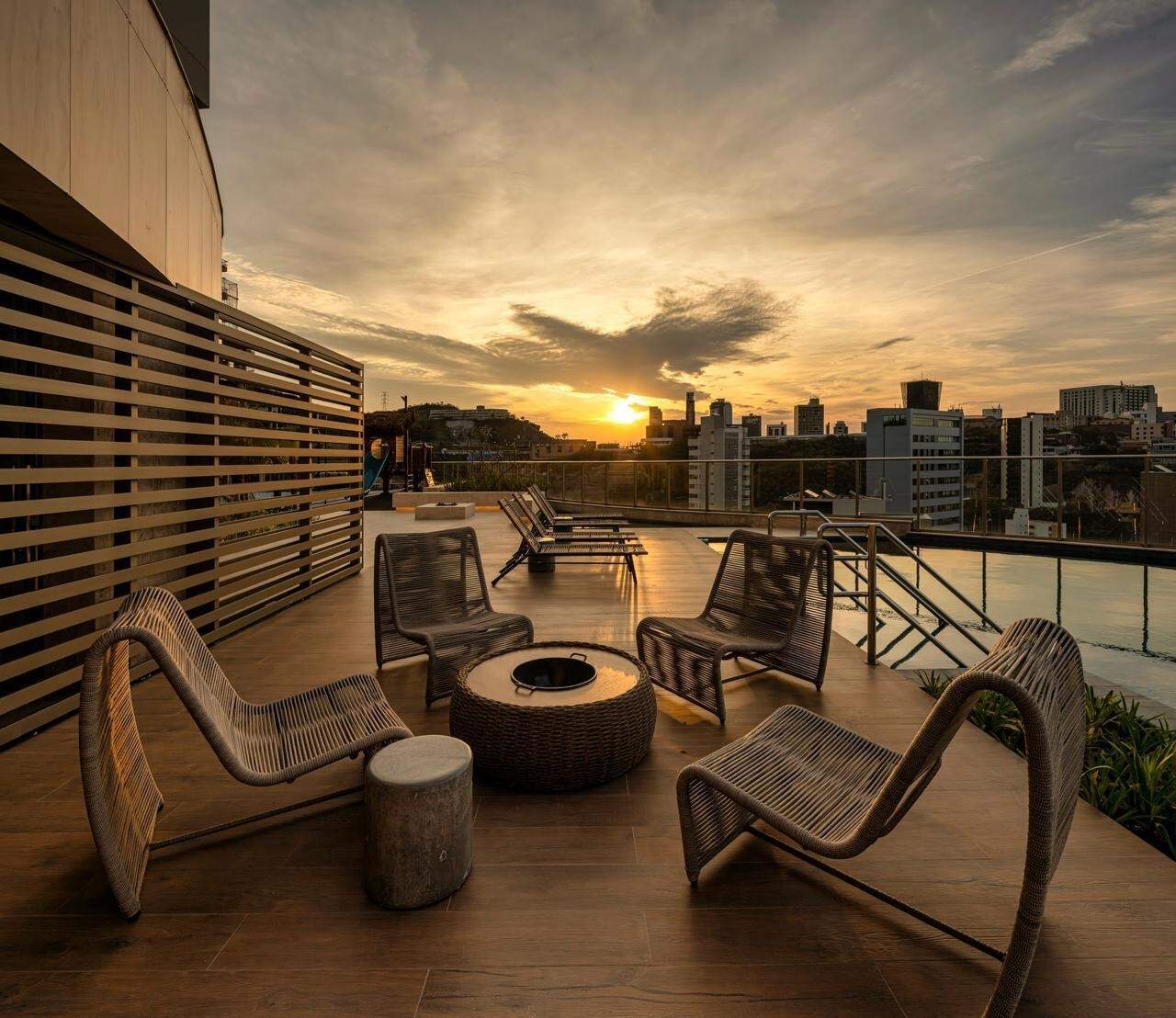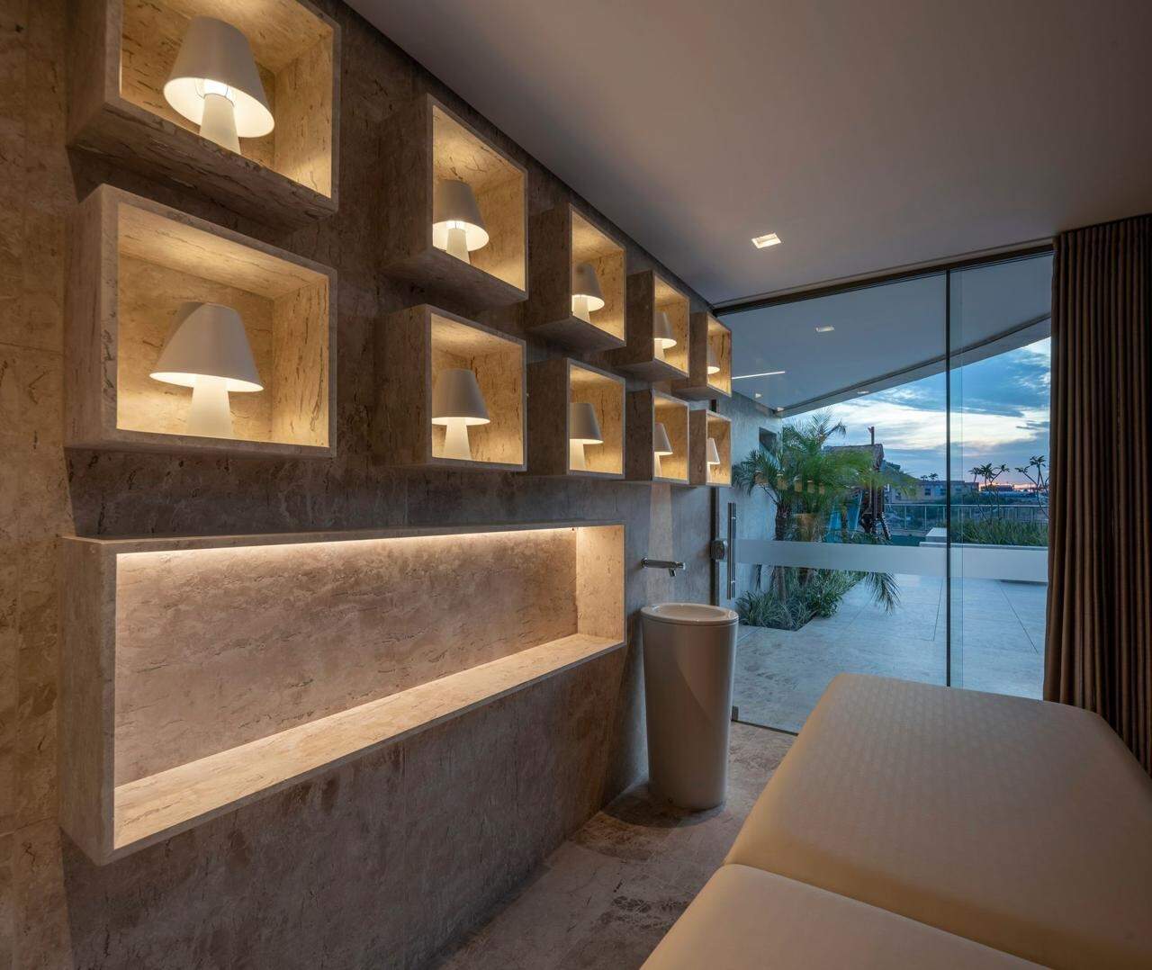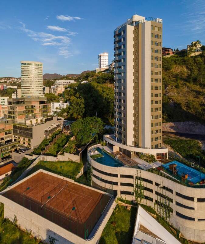 Áreas sociais com lounge gourmet, espaço kids, quadra infantil, piscina adulto com raia aquecida, piscina infantil aquecida, sauna, sala de massagem, fitness center e quadra de tênis de saibro.