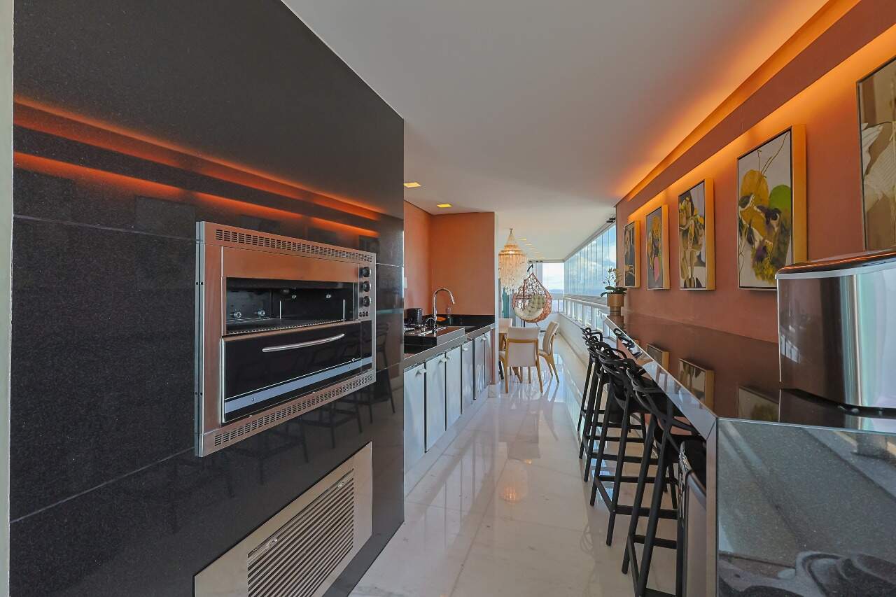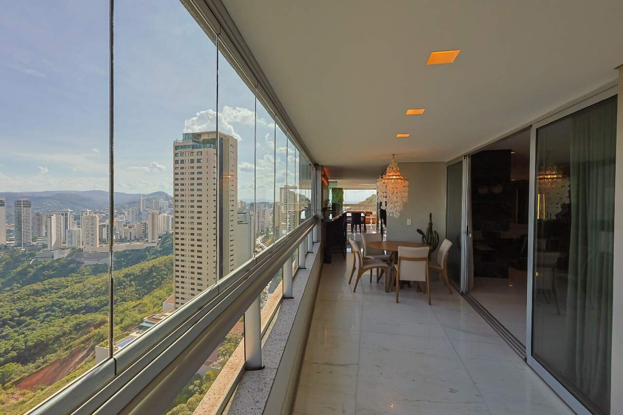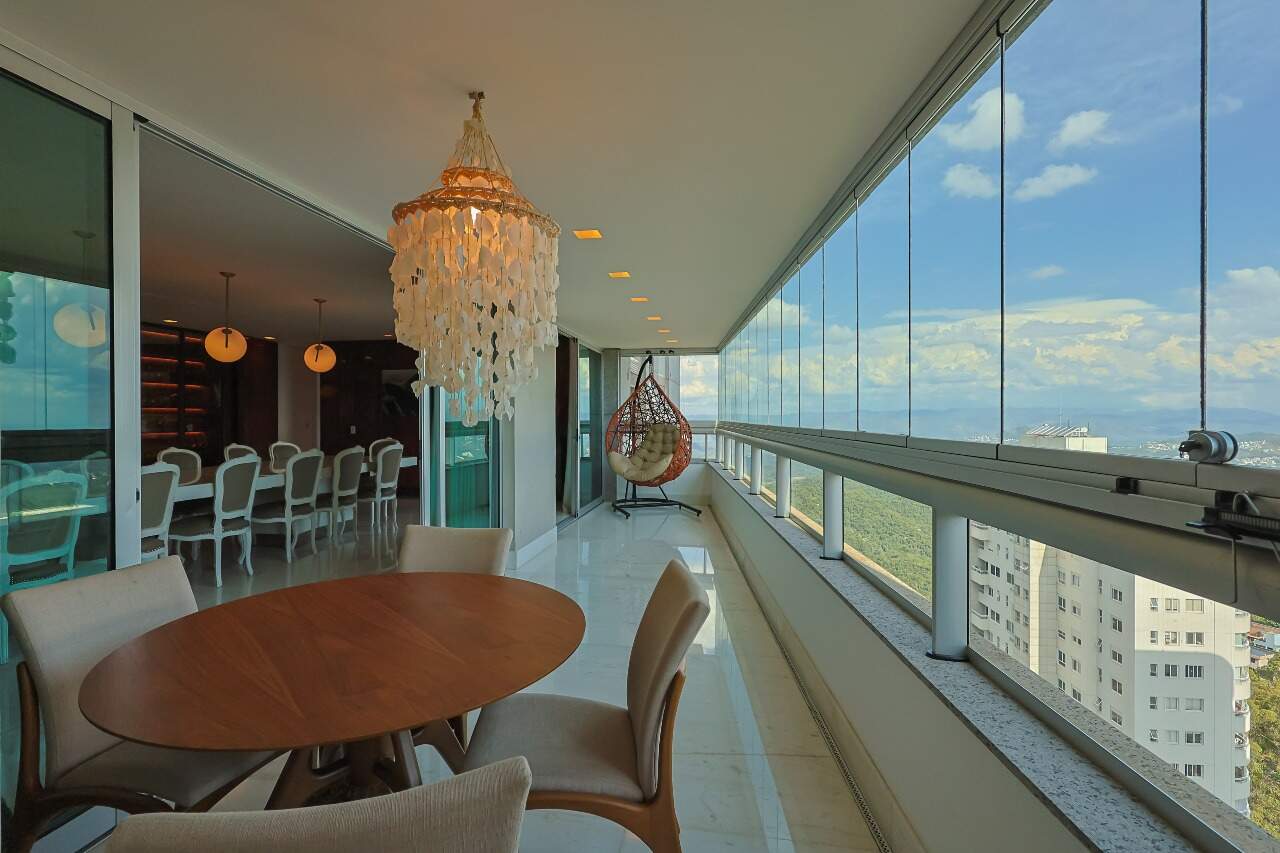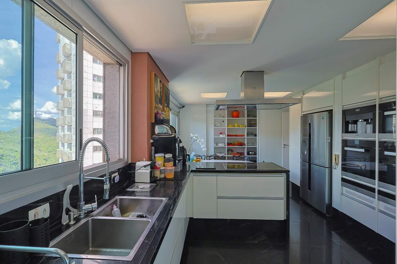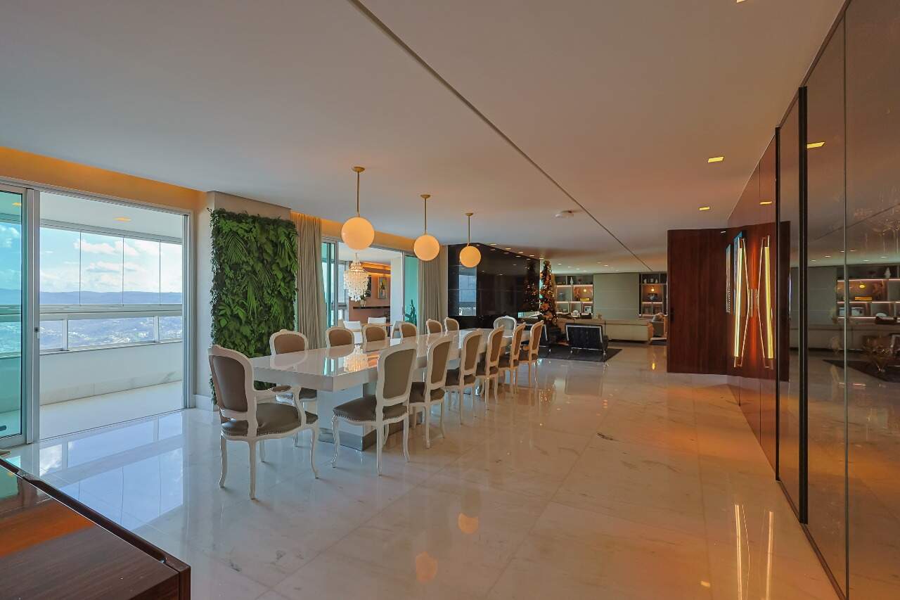 Apartamento altíssimo padrão, andar alto, com vista definitiva para as montanha, sala para 4 ambientes, rico em marcenaria, piso em mármore branco, varanda gourmet, cristaleira, rouparia, 5 quartos, sendo 4 suítes, todas com armários e closets, banhos com piso em mármore, lavabo, suíte master com 2 closets e 2 banhos, ar condicionado, janelas amplas, escritório, copa/ cozinha, ilha em granito, despensa, DCE
