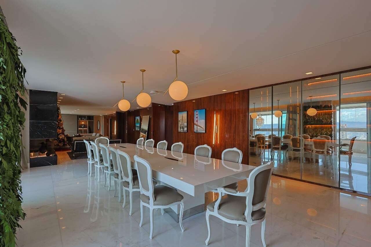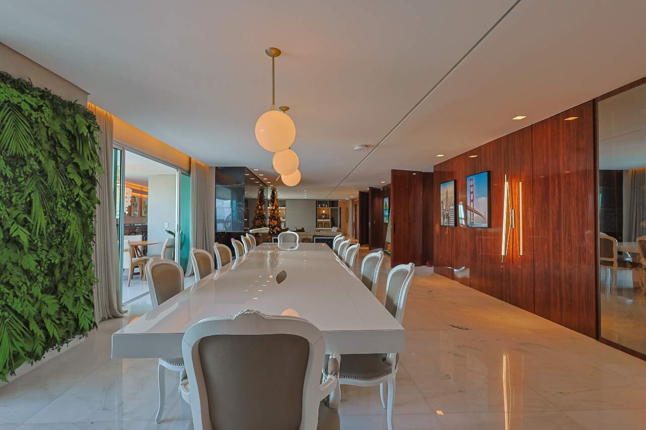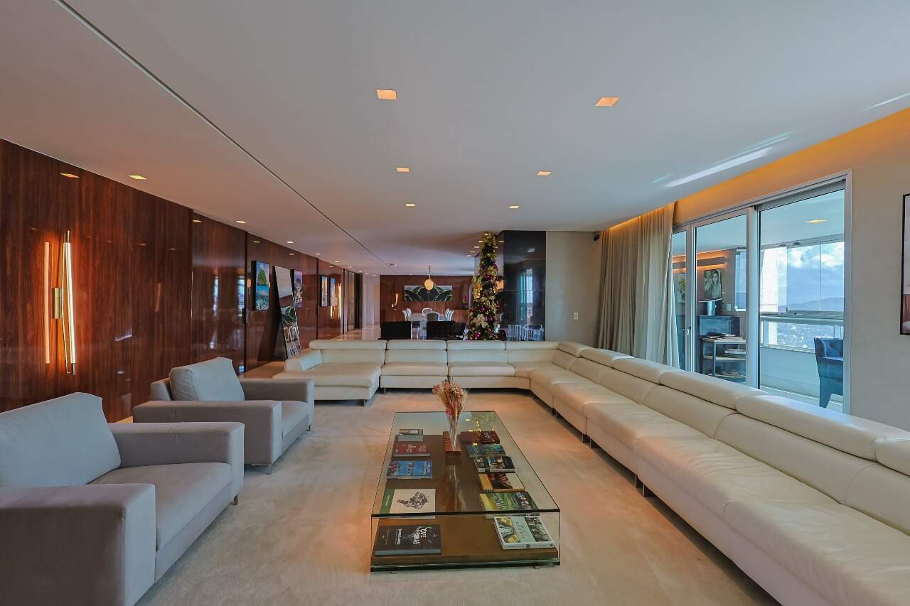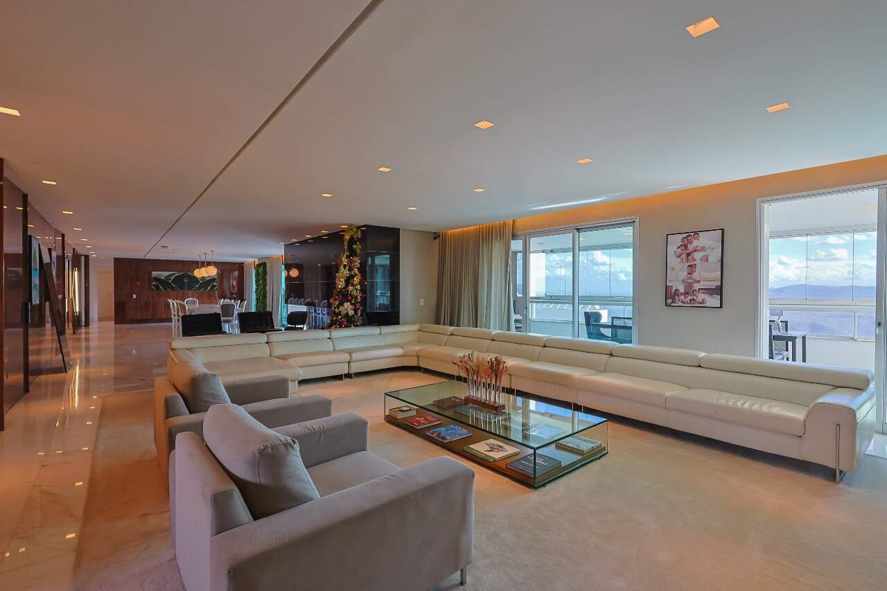 Apartamento altíssimo padrão, andar alto, com vista definitiva para as montanha, sala para 4 ambientes, rico em marcenaria, piso em mármore branco, varanda gourmet, cristaleira, rouparia, 5 quartos, sendo 4 suítes, todas com armários e closets, banhos com piso em mármore, lavabo, suíte master com 2 closets e 2 banhos, ar condicionado, janelas amplas, escritório, copa/ cozinha, ilha em granito, despensa, DCE