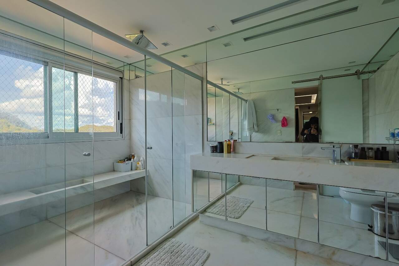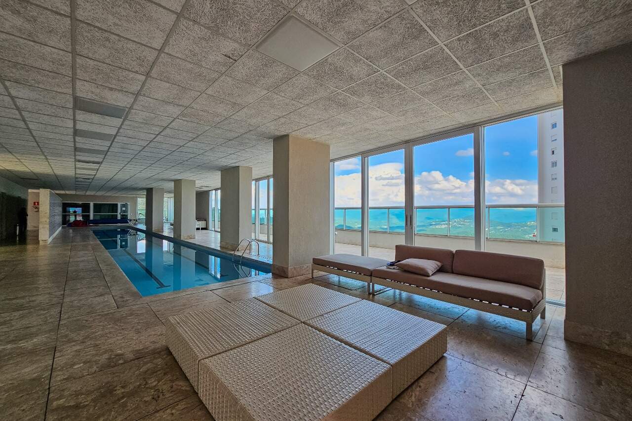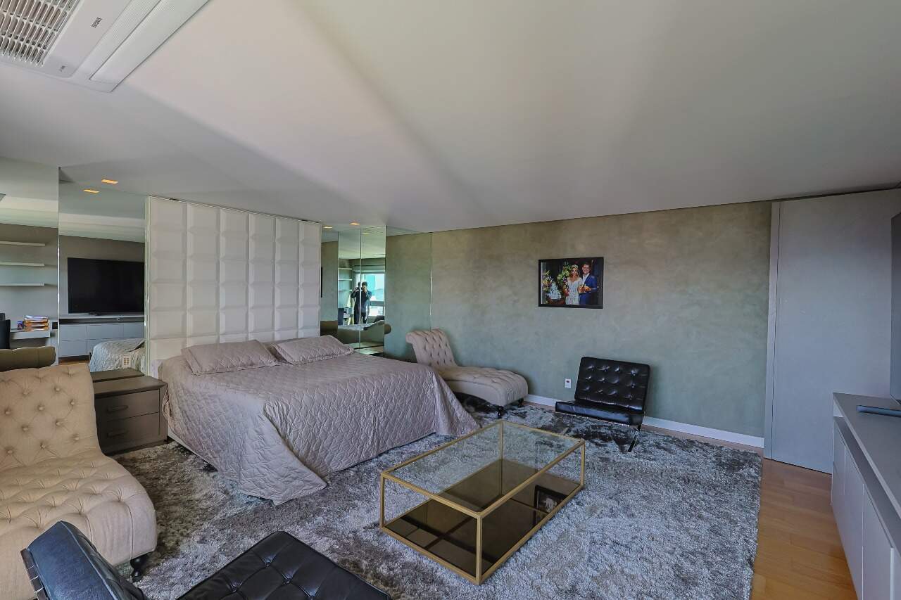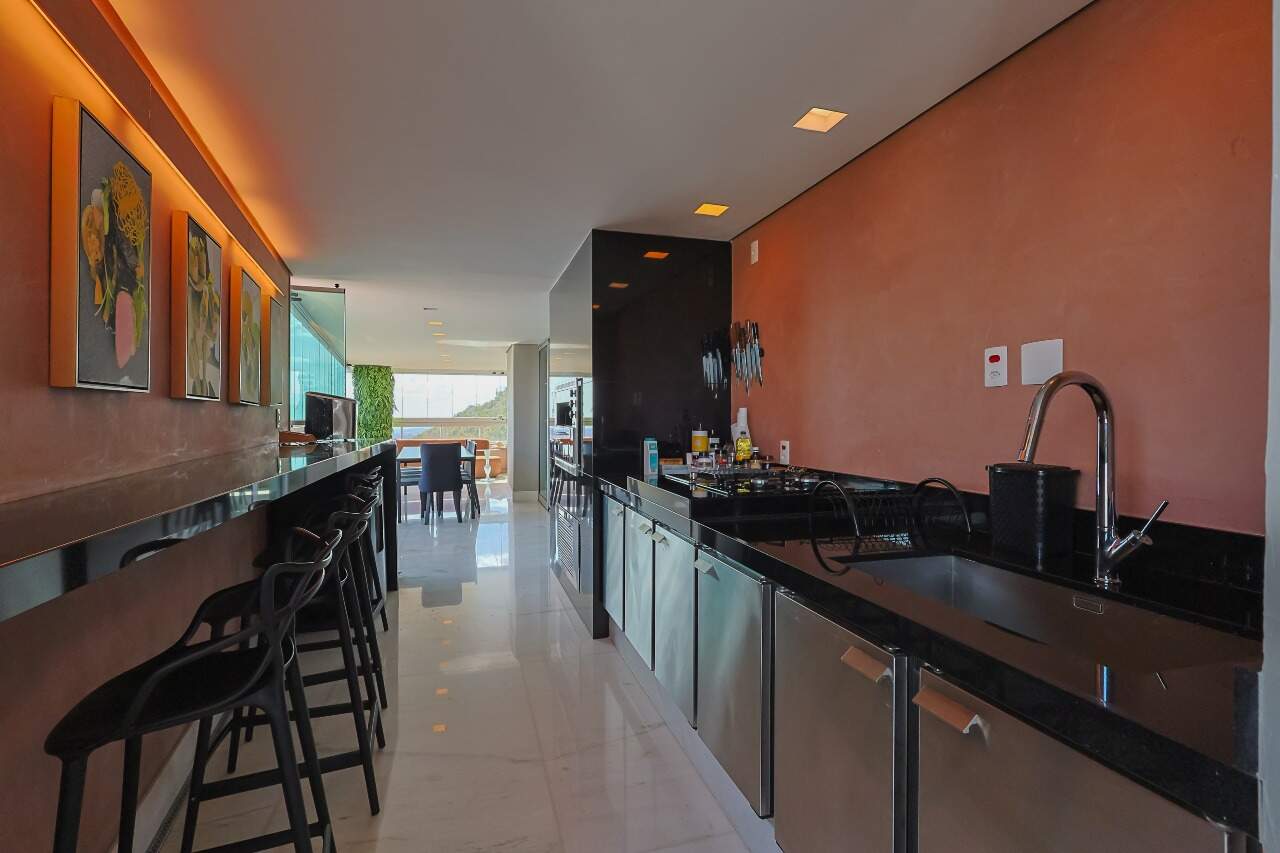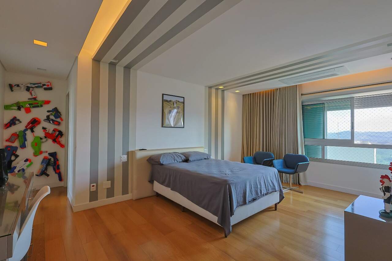 Apartamento altíssimo padrão, andar alto, com vista definitiva para as montanha, sala para 4 ambientes, rico em marcenaria, piso em mármore branco, varanda gourmet, cristaleira, rouparia, 5 quartos, sendo 4 suítes, todas com armários e closets, banhos com piso em mármore, lavabo, suíte master com 2 closets e 2 banhos, ar condicionado, janelas amplas, escritório, copa/ cozinha, ilha em granito, despensa, DCE