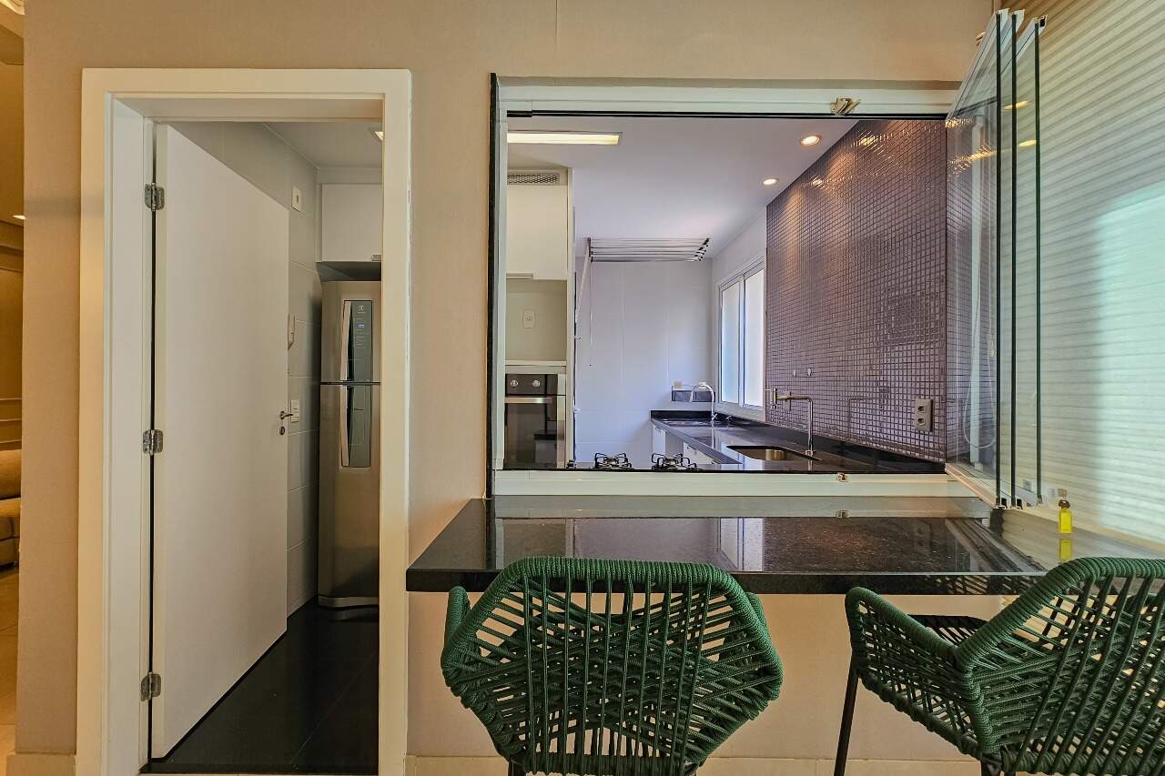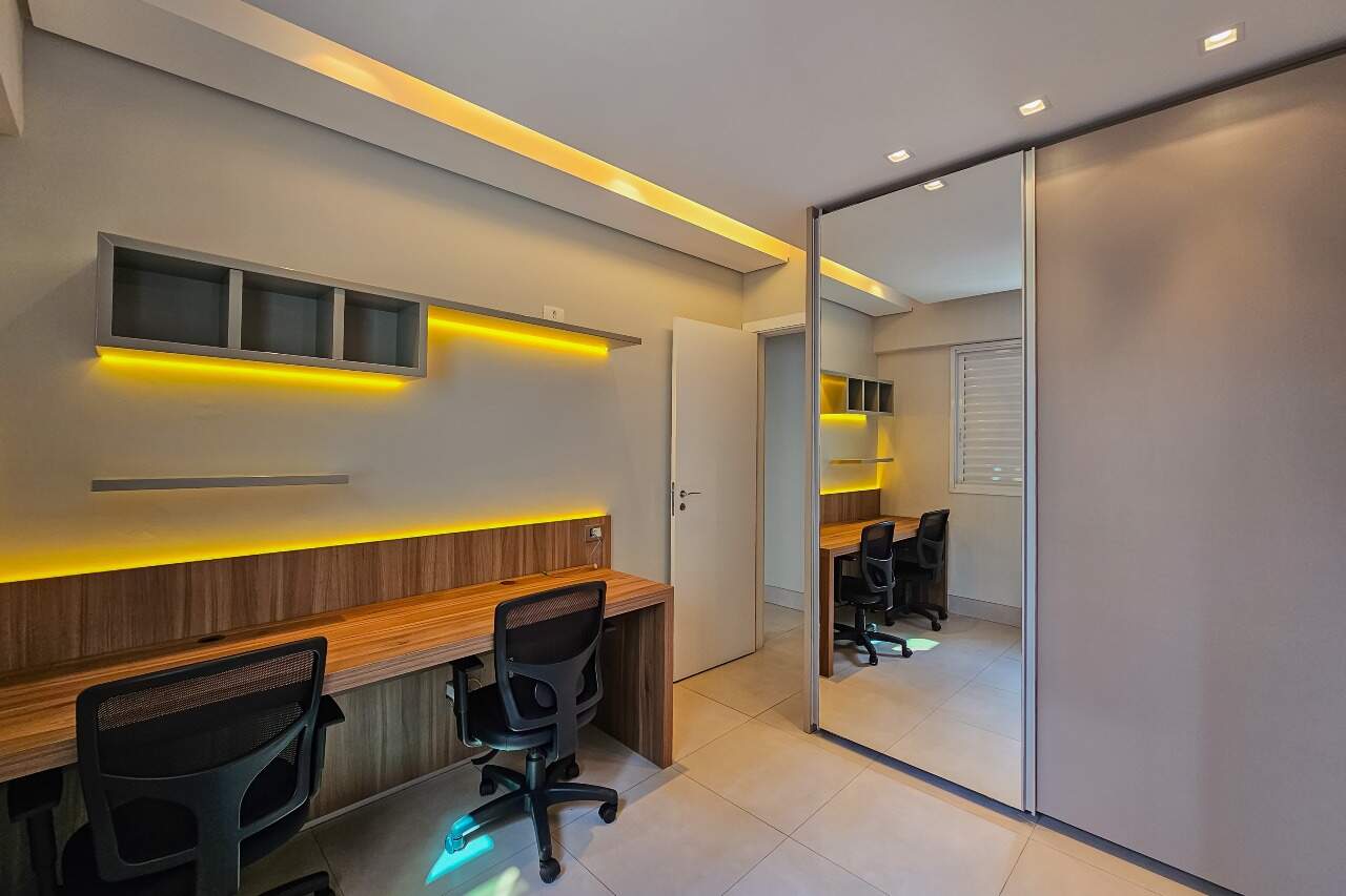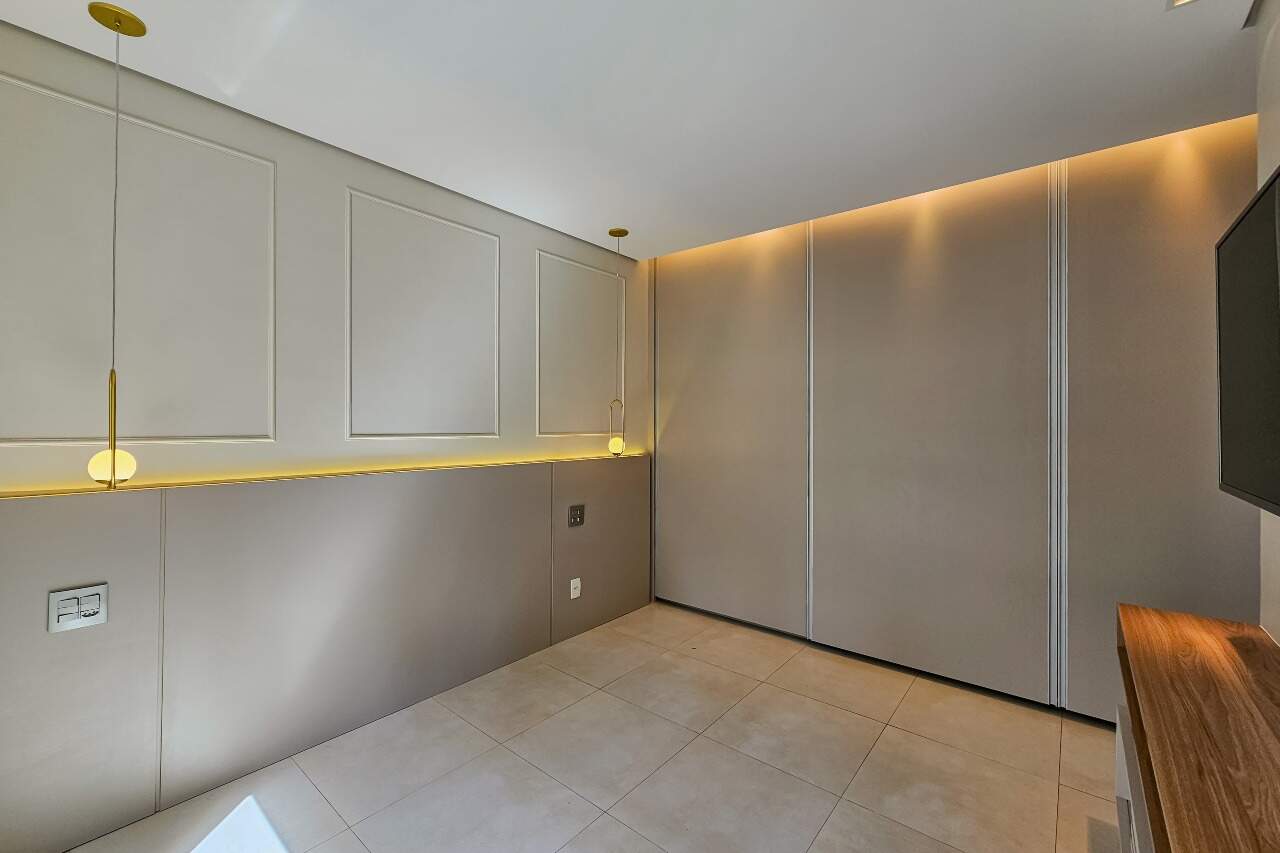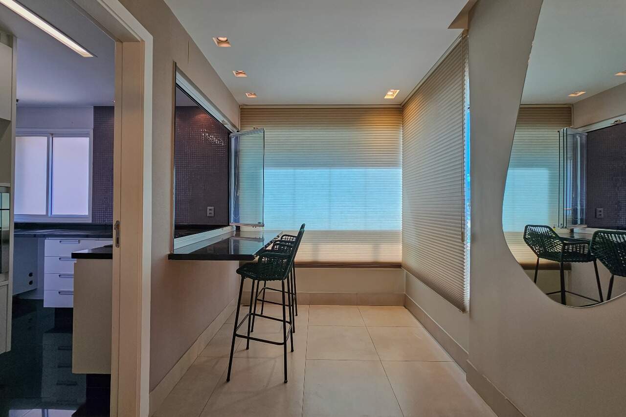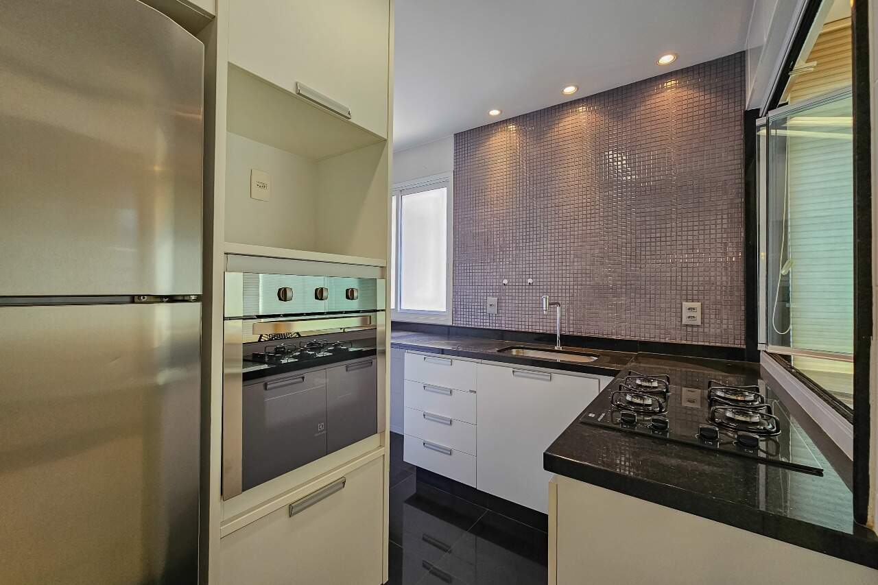 Andar alto, armários e iluminação planejados, cozinha montada e equipada.