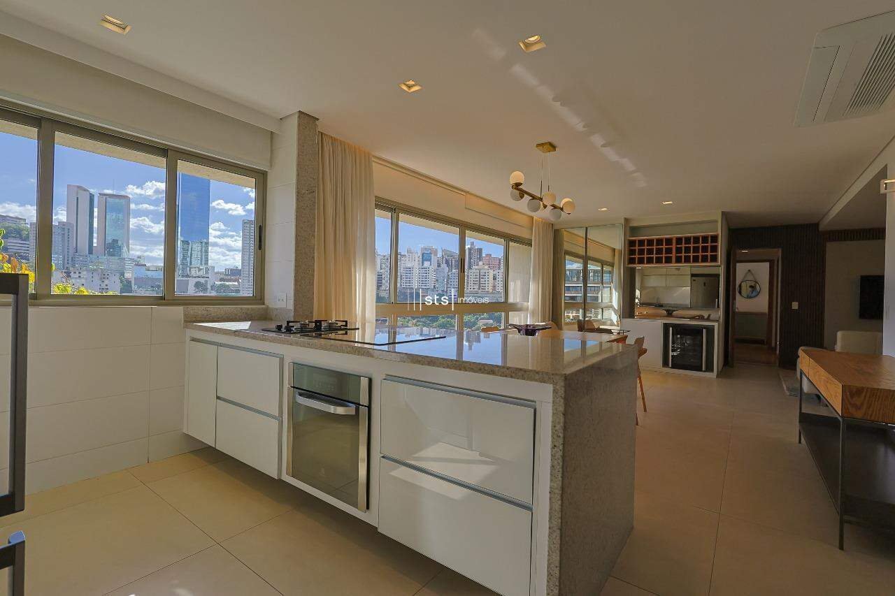 Andar alto, vista panorâmica, lavabo, cozinha totalmente equipada e integrada à sala.