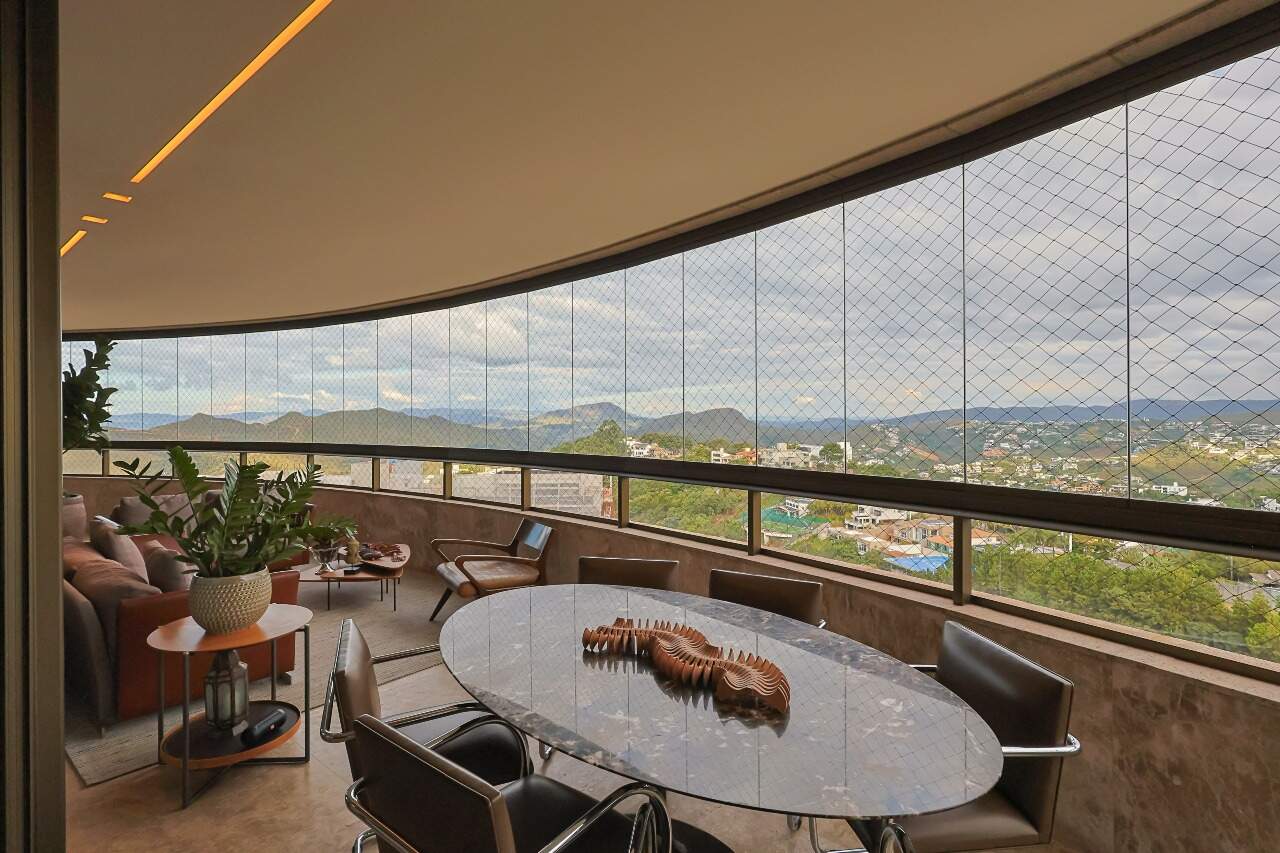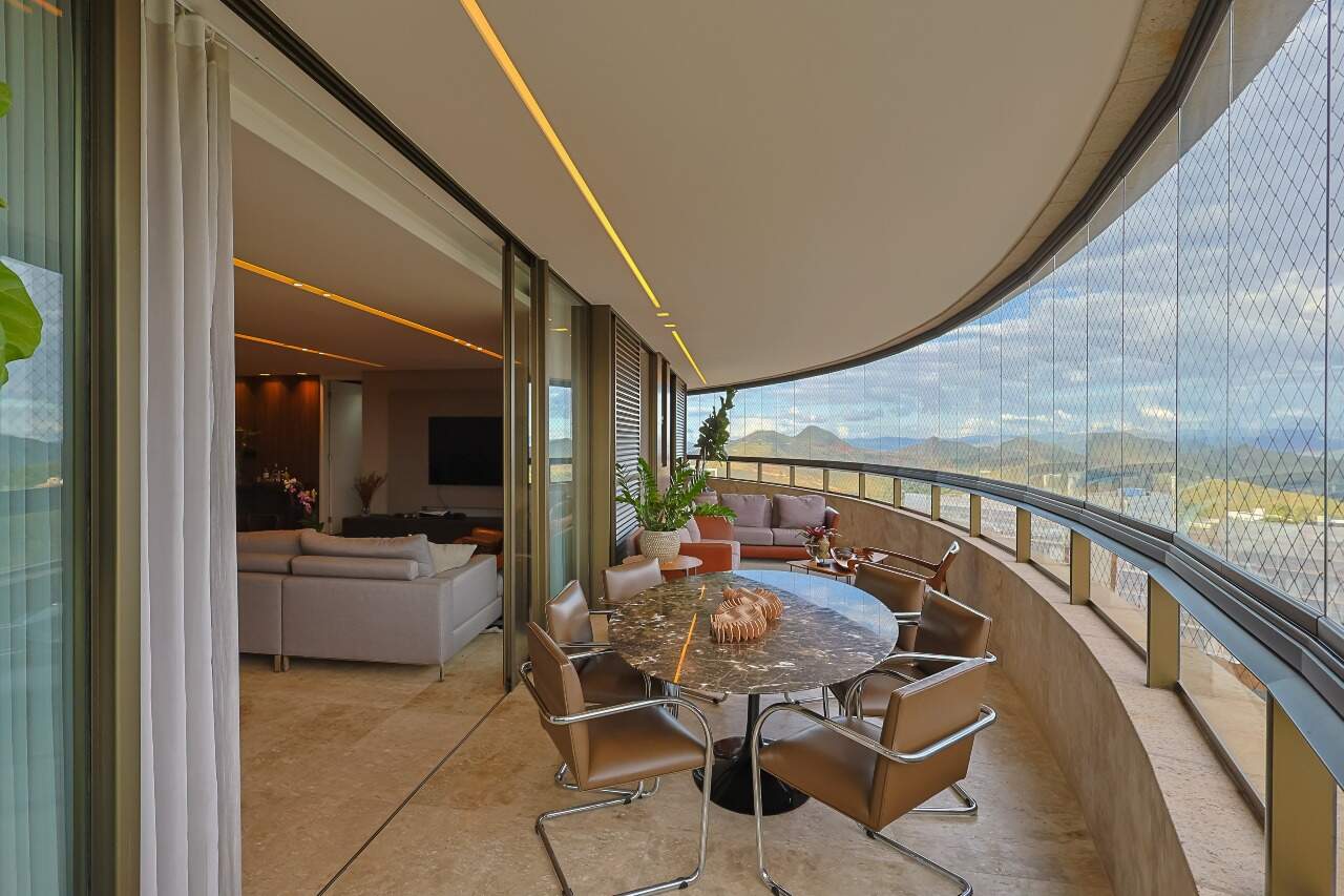 Uma varanda enorme, integrada à uma sala de jantar e que dá acesso aos quartos, proporcionando muita luminosidade e integração.