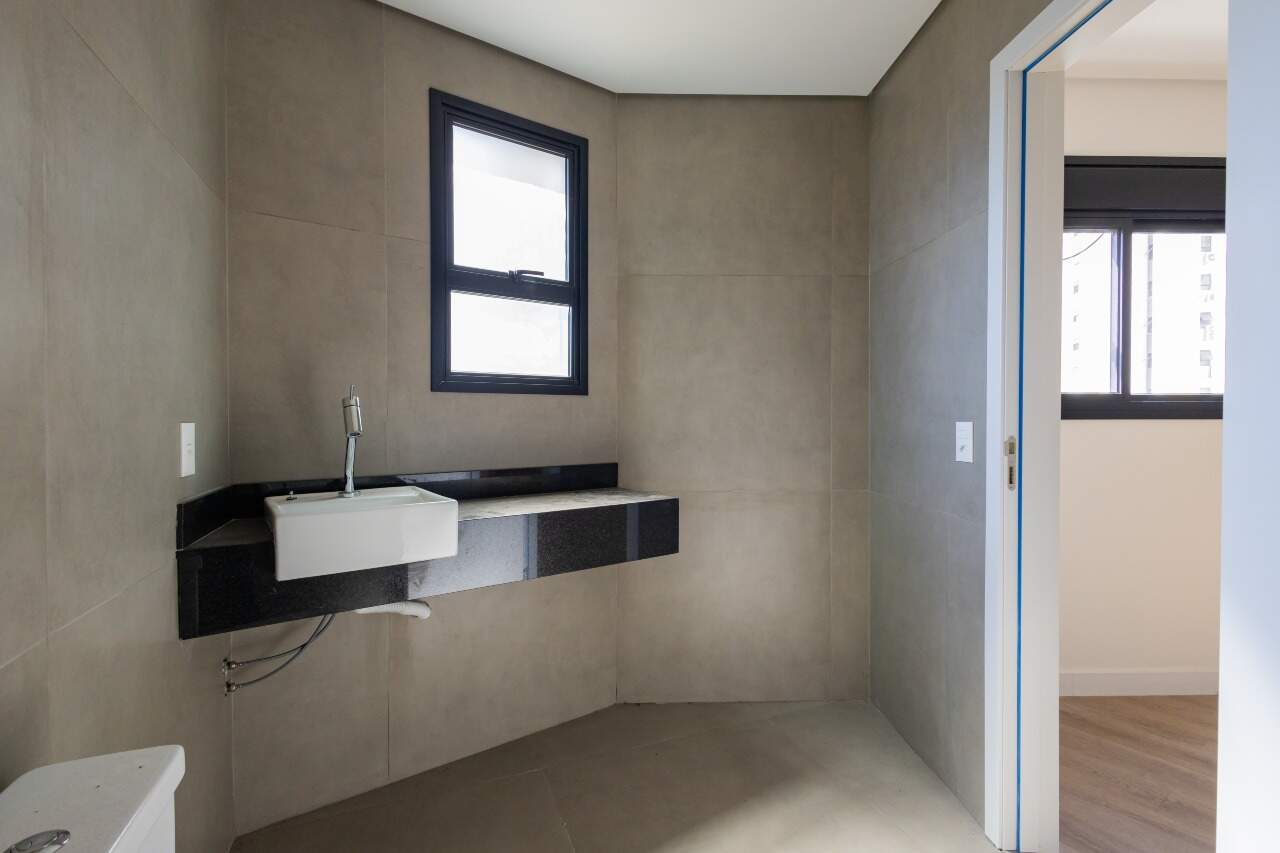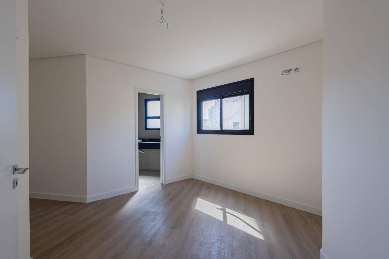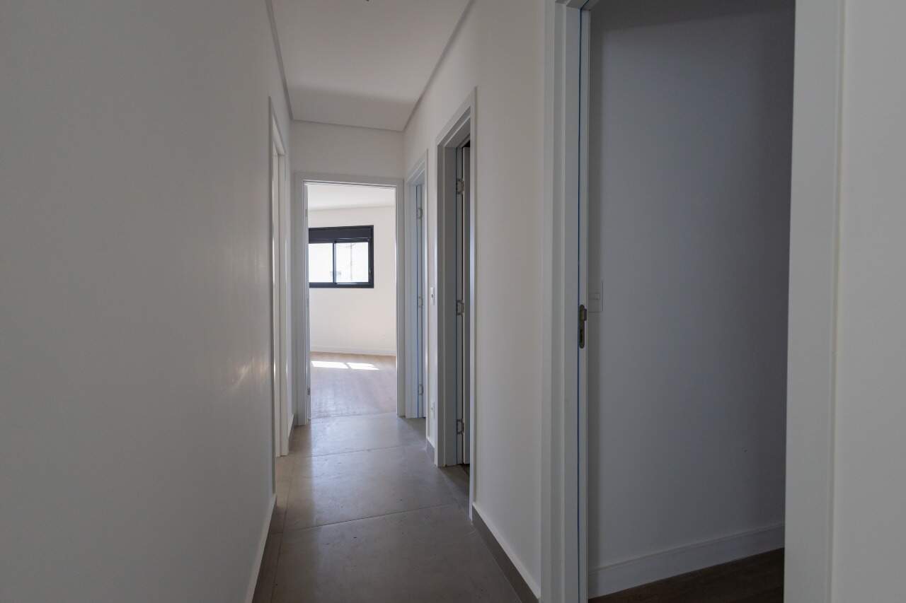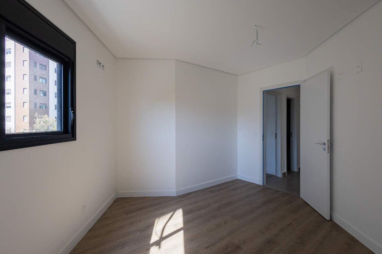 Apresenta piso em porcelanato nas áreas sociais e molhadas. Quartos e circulação contam com revestimento em laminado de madeira. As janelas dos quartos dispõem de persianas integradas.