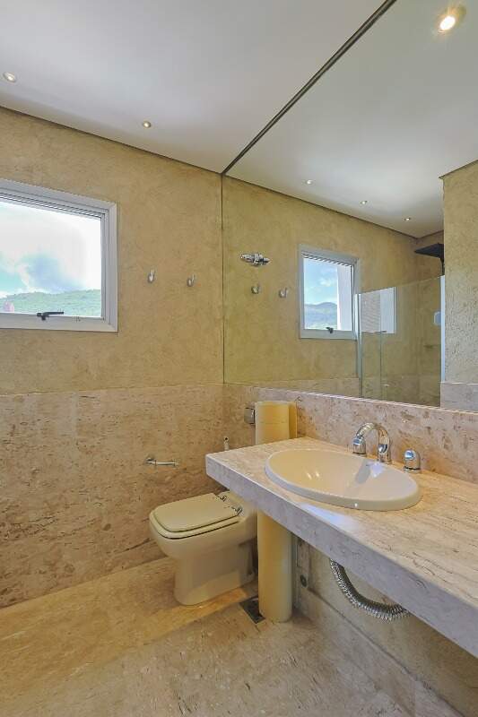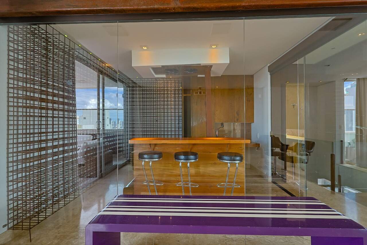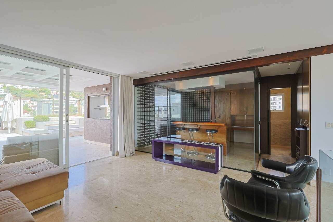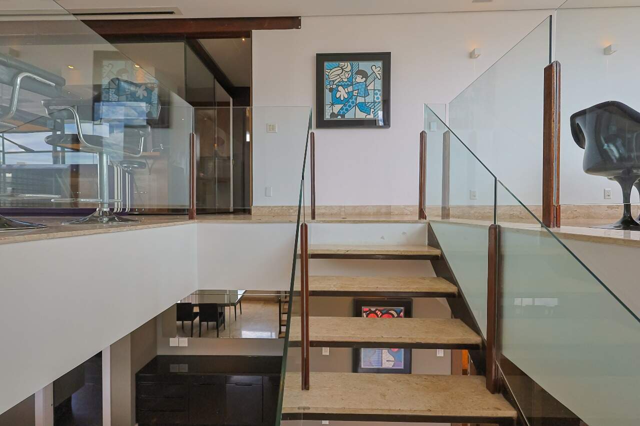 O andar superior possui ampla área social integrada, ambiente automatizado (cortinas, projetor e telão), adega climatizada e 1 quarto adicional.