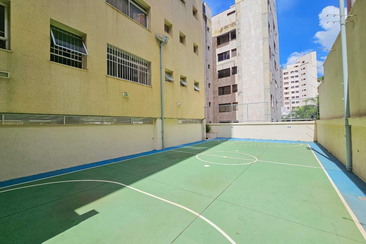 O prédio oferece lazer com piscina, salão de festas e quadra esportiva.