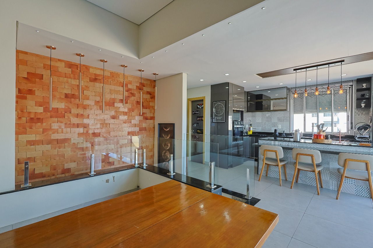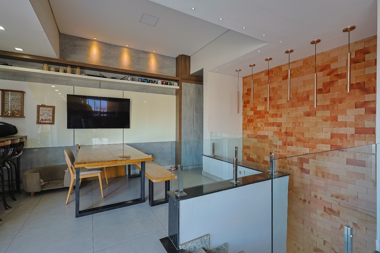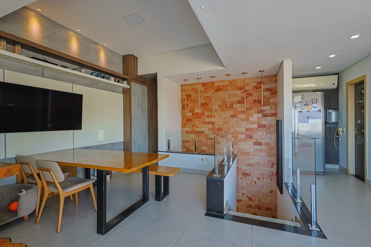 O segundo nível revela um espaço social moderno e integrado, com ampla sala conectada a uma cozinha gourmet equipada, com churrasqueira e marcenaria de excelente qualidade. A área externa complementa o ambiente, que se beneficia de vista definitiva, ótima ventilação e total privacidade — ideal para receber com elegância.