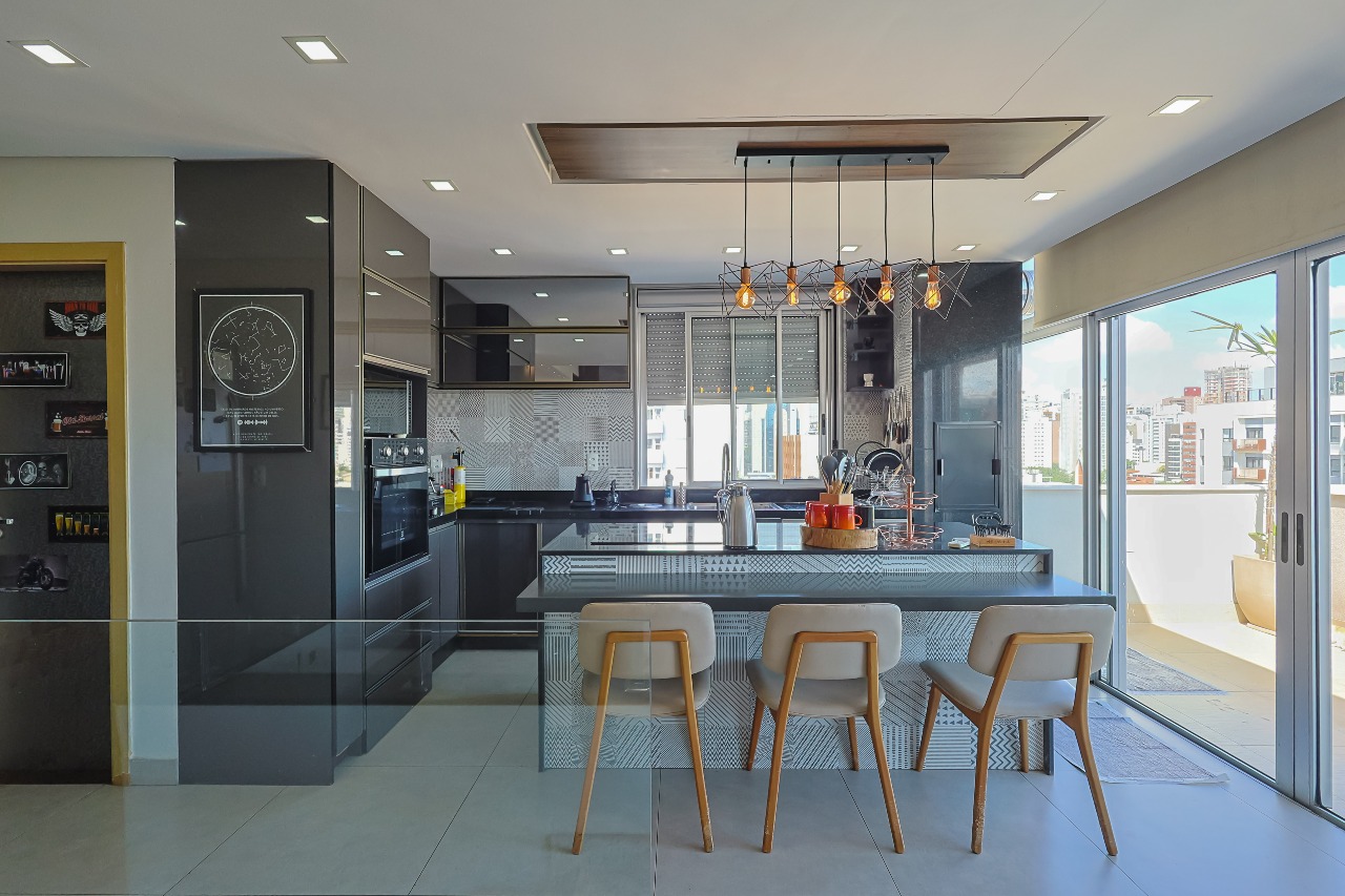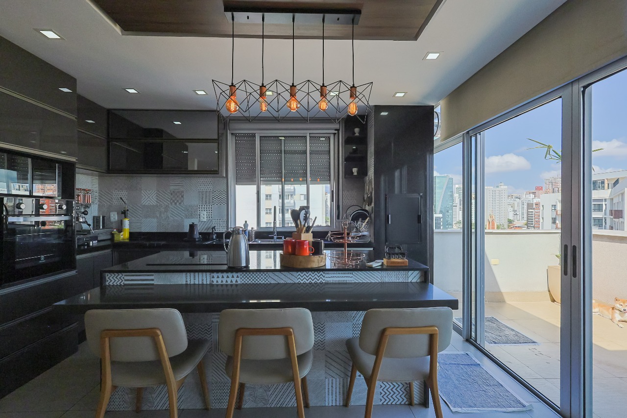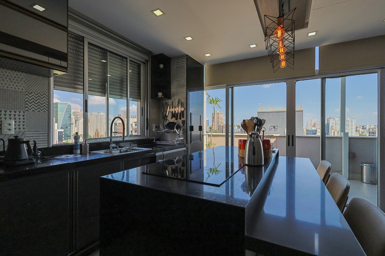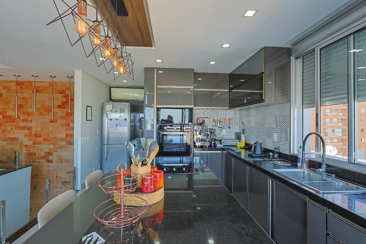 O segundo nível revela um espaço social moderno e integrado, com ampla sala conectada a uma cozinha gourmet equipada, com churrasqueira e marcenaria de excelente qualidade. A área externa complementa o ambiente, que se beneficia de vista definitiva, ótima ventilação e total privacidade — ideal para receber com elegância.