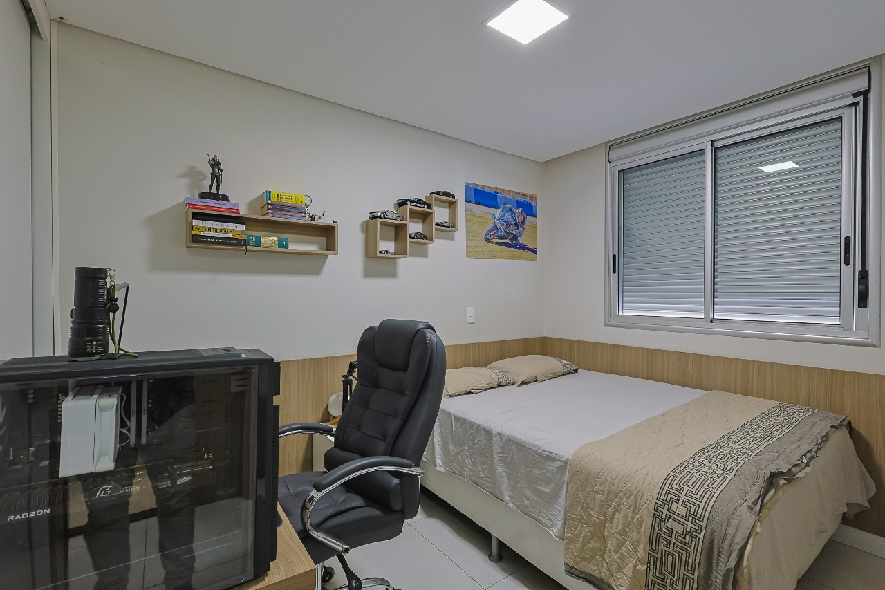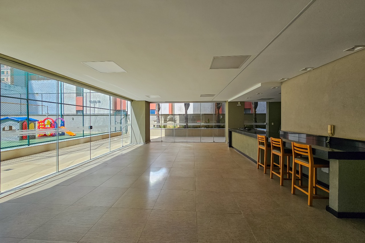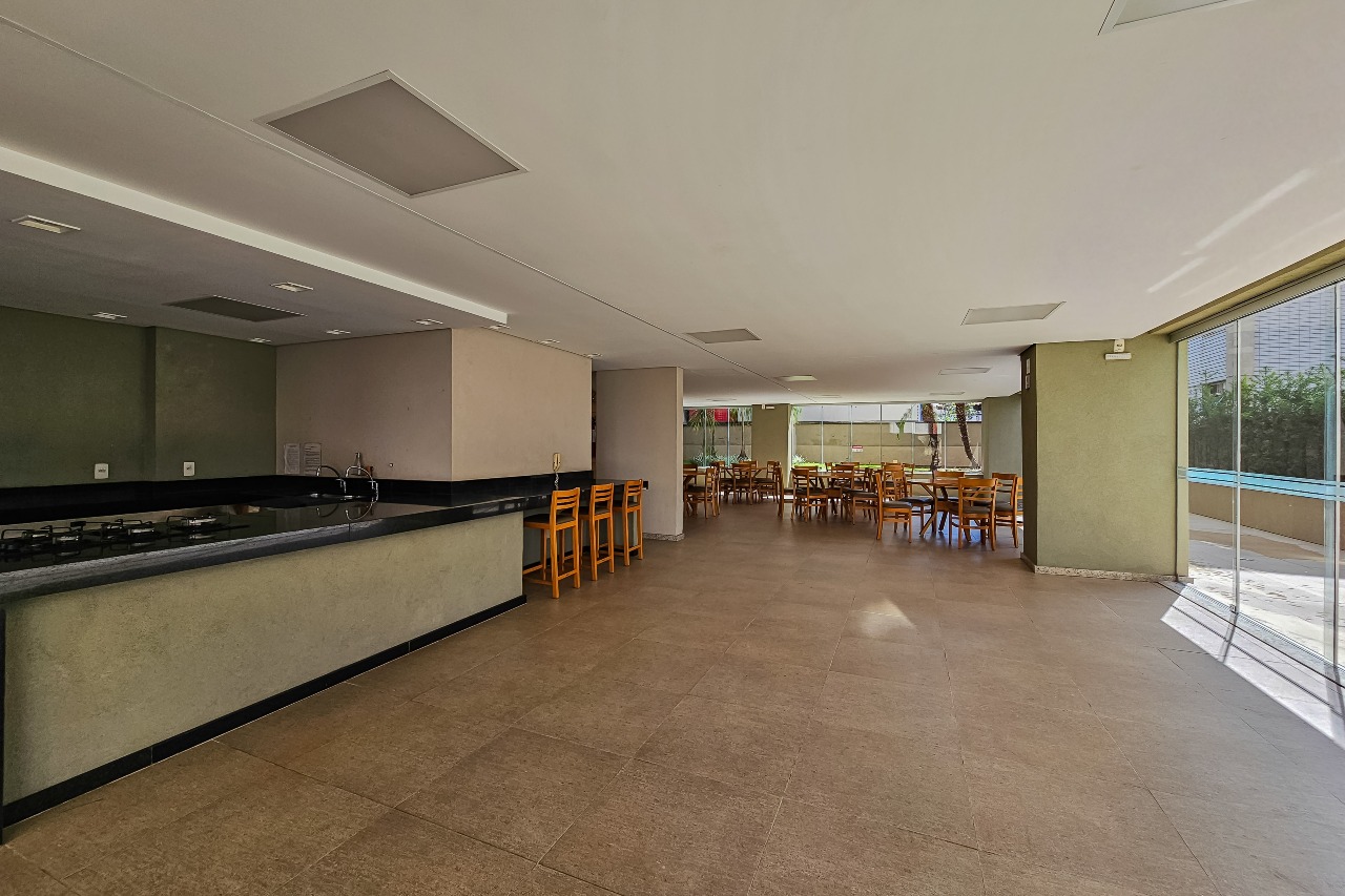 O edifício oferece infraestrutura completa, com portaria 24 horas, salão de festas, quadra poliesportiva, espaço gourmet equipado, além de sistema de segurança com câmeras e alarme.
