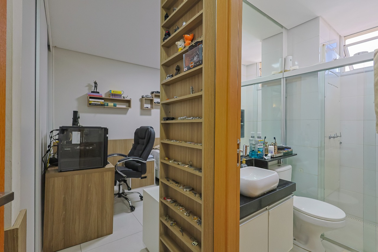 No primeiro nível, encontra-se a área íntima, composta por uma acolhedora sala de estar, lavabo e duas amplas suítes com armários planejados e acabamento de alto padrão. Todos os ambientes contam com ar-condicionado, proporcionando máximo conforto térmico. Apesar da proximidade com importantes vias, o imóvel se destaca pelo silêncio e tranquilidade.